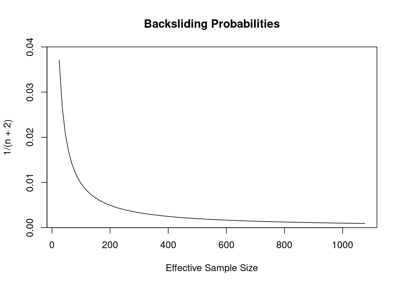 We end up with a question of effective sample size. Out of 1076 democracy years, how many truly independent samples do we have? The graph below plots the range of probabilities:
