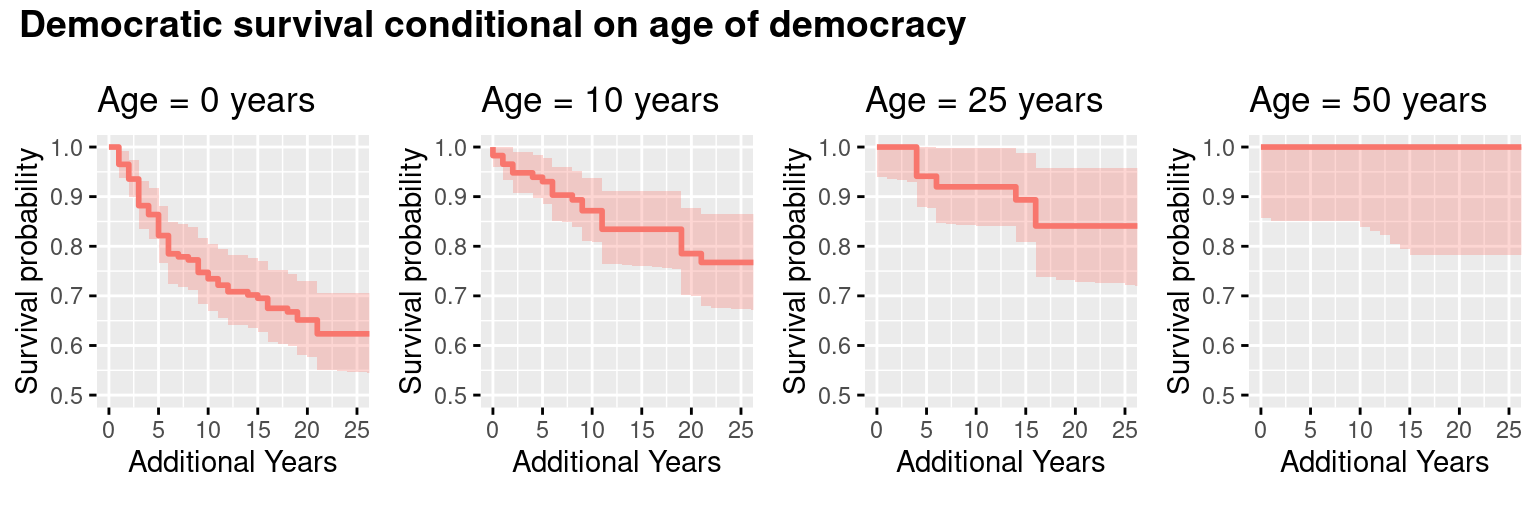 But contrary to Little and Przeworski, this model displays a wide range of uncertainty about the true probability, where older democracies could have up to a 14% chance of backsliding (at the extreme end of the 95% confidence interval, which is the shaded area). The survival analysis approach isn’t the best here, though, because it assumes that each year has a separate probability. The probability of a 50-year-old democracy backsliding is estimated separately from the probability for a 51-year-old democracy, and so forth. The result is that each year has a small sample and the confidence intervals are very large, probably too large for this case.
